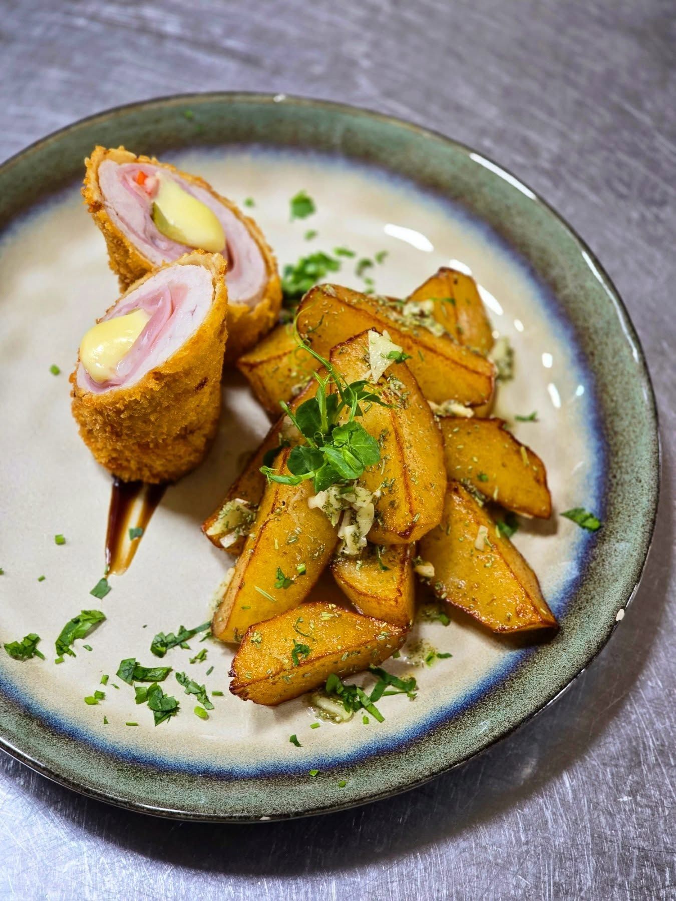 Cordon Bleu (făcut de noi) cu cartofi cu rozmarin.